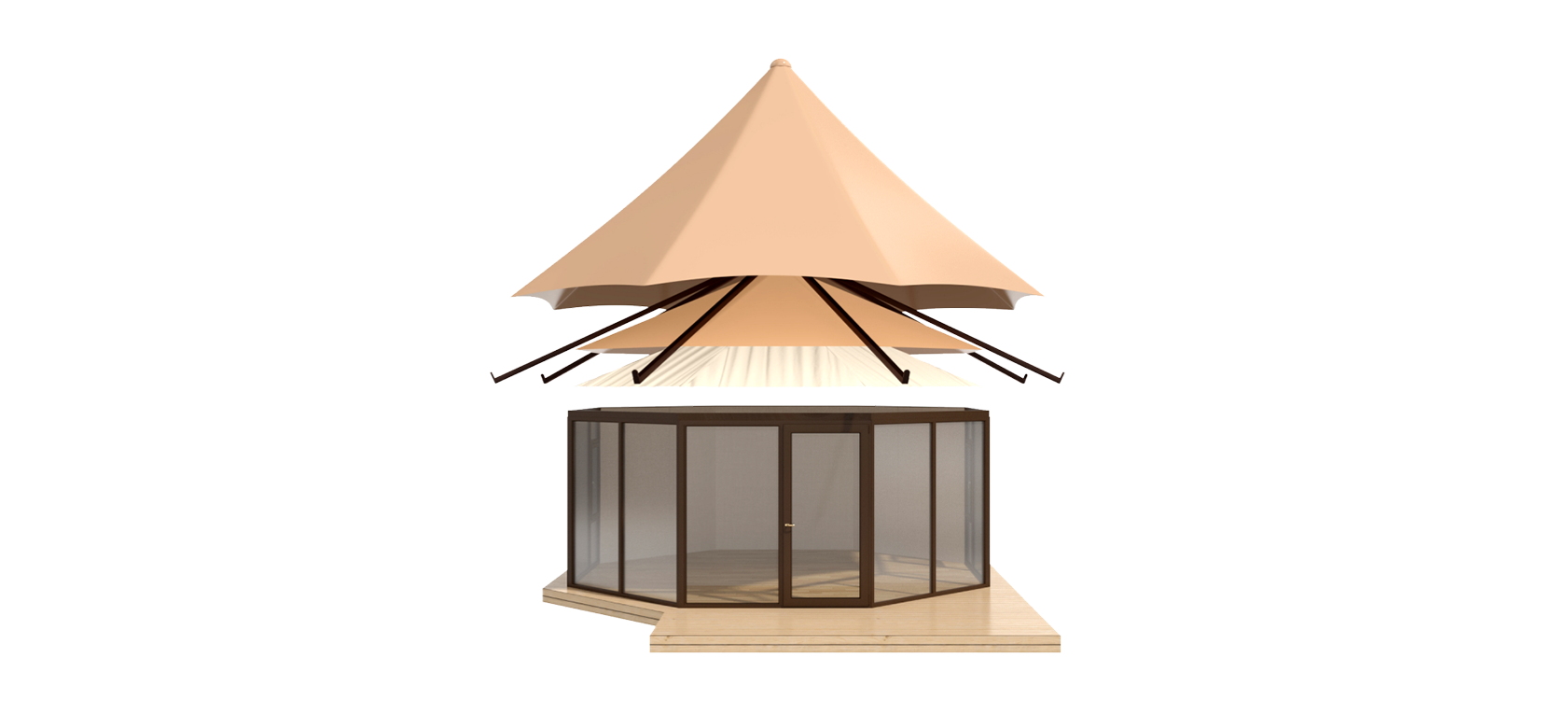 Xingfang Tent House features a steel-membrane structure. The frame is made of corrosion-resistant, powder-coated, hot-dip galvanized steel, providing durability against humidity, salt, and harsh environments. The roof is covered with high-strength architectural membrane, offering a unique aesthetic, reliable performance, and a 20- year warranty for wind and rain protection.